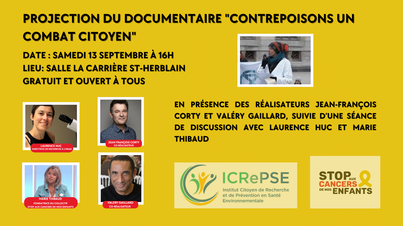 → Projection / débat du film documentaire CONTREPOISONS – Un combat citoyen, organisée à la salle de La Carrière à Saint-Herblain, en présence des réalisateurs, d’acteurs, de scientifiques et de familles, favorisant l’échange et la réflexion collective.